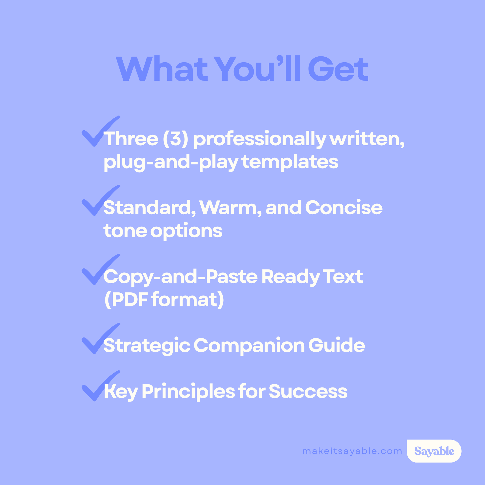 All templates and accompanying materials remain the intellectual property of Sayable. Purchasing a template grants usage rights, not ownership.